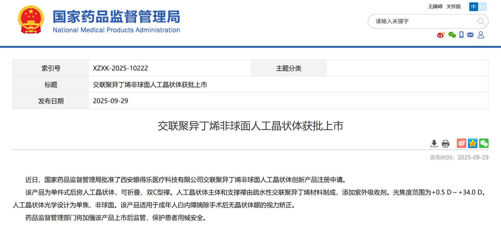 9月29日,国家药品监督管理局发布公告,西安眼得乐医疗科技有限公司自主研发的创新医疗器械交联聚异丁烯非球面人工晶状体,正式获批。这标志着全球眼科行业30年来迎来了首个新材料人工晶状体。该产品为单件式后房人工晶状体,可折叠,双C型襻。人工晶状体主体和支撑襻由疏水性交联聚异丁烯材料制成,添加紫外吸收剂。光焦度范围为 +0.5 D 至 +34.0 D 。人工晶状体光学设计为单焦、非球面。该产品适用于成年人白内障摘除手术后无晶状体眼的视力矫正。特别是该产品全球首次采用交联聚异丁烯材料,兼具高折射率(1.52)、高阿贝值(50)特点,采用 6.5 毫米大光学面设计,可通过 ≤2.0 毫米的微小切口植入,可为全球白内障患者带来更加理想的视觉体验。