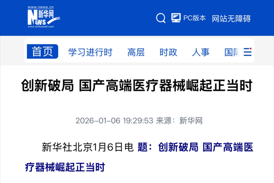 1月6日,新华网发文《创新破局国产高端医疗器械崛起正当时》,全面总结了我国高端医疗器械的创新成果。文中介绍:截至2025年,国家药监局共批准76个国产创新医疗器械上市,数量连续3年维持高位,覆盖人工智能、肿瘤放射治疗、生物医用材料等多个前沿领域,清晰勾勒出我国高端医疗器械产业的转型图景,梳理总结了国产高端医疗器械在技术创新、政策支持、市场拓展等方面取得的显著成就,以及其在全球医疗产业中的崛起趋势。